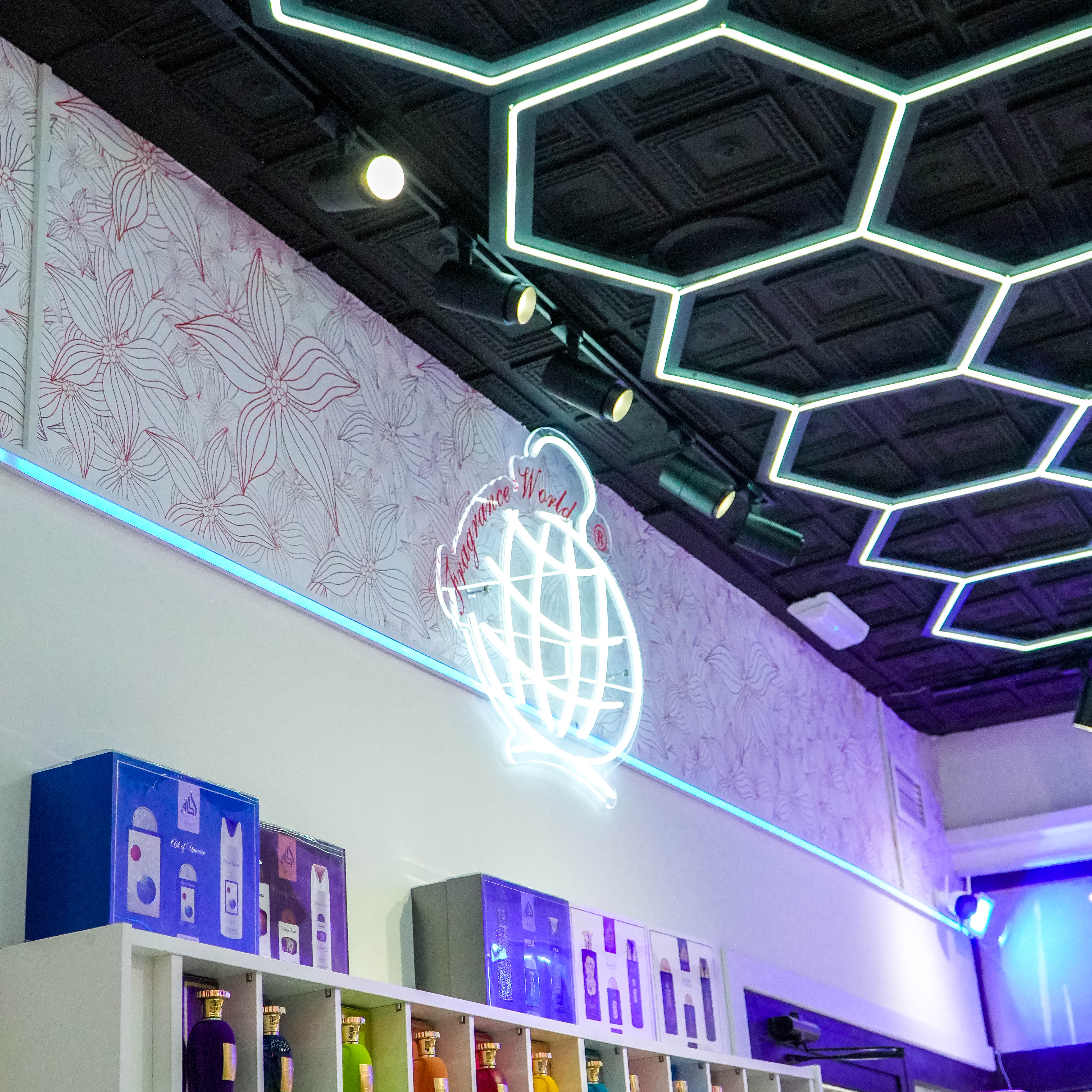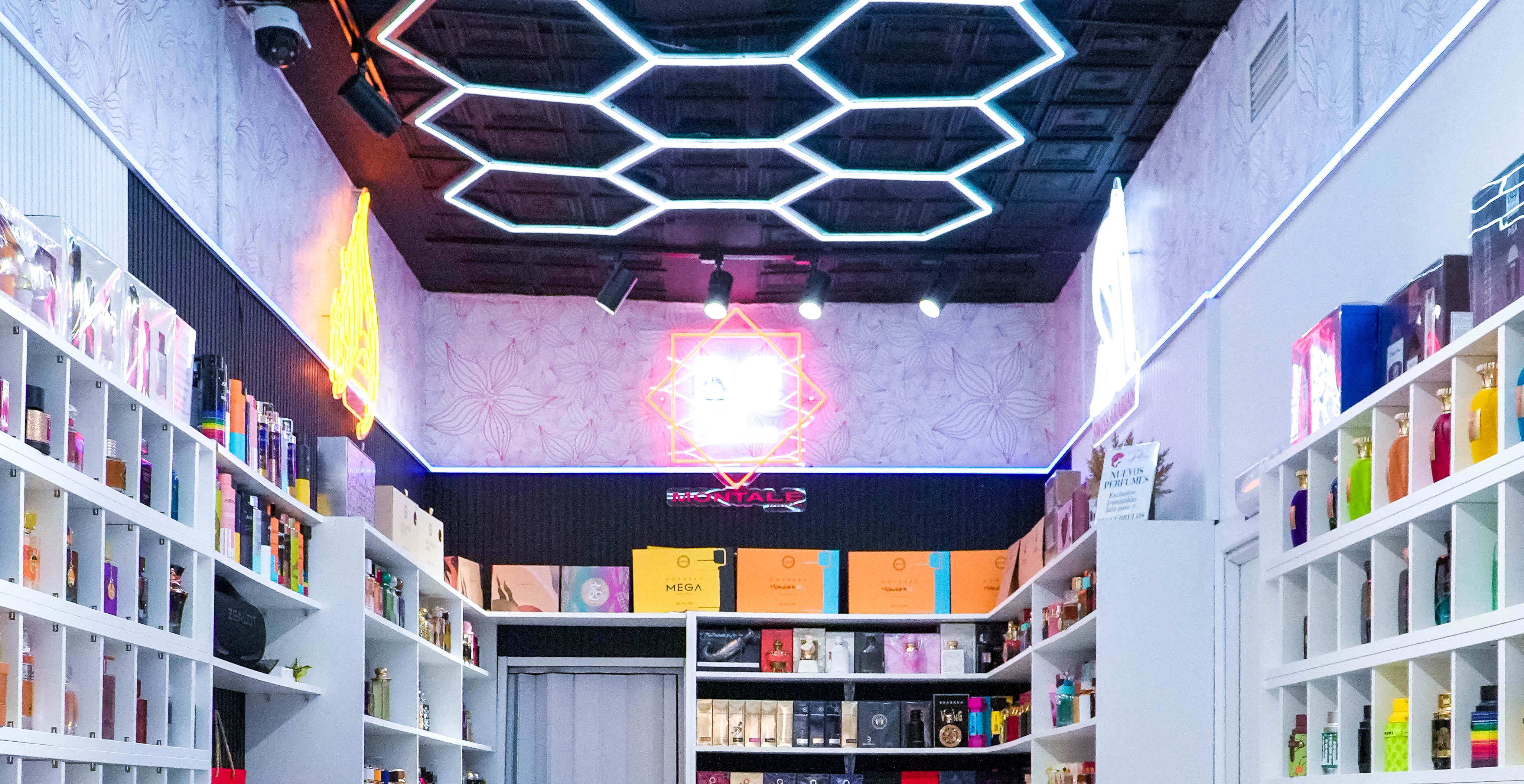 La instalación destaca por una iluminación en neón con forma de panal de abeja, que aporta identidad, dinamismo y un carácter único al espacio. Este sistema se combina con iluminación directa sobre los expositores, mediante focos y carriles, asegurando una correcta visualización de los productos y realzando cada detalle.